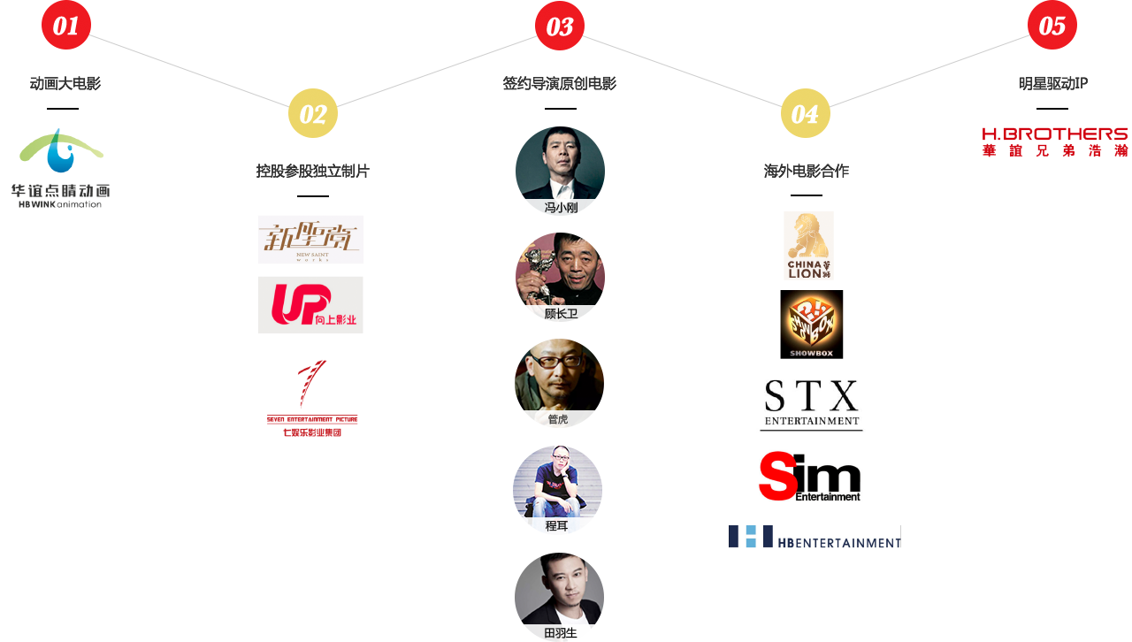 浩瀚娱乐、尊龙凯时·(中国)人生就是搏!聚星、东阳美拉和尊龙凯时·(中国)人生就是搏!点睛动画等;以及产量、品质都非常稳定的签约导演团队,如冯小刚、管虎、程耳和田羽生等等。